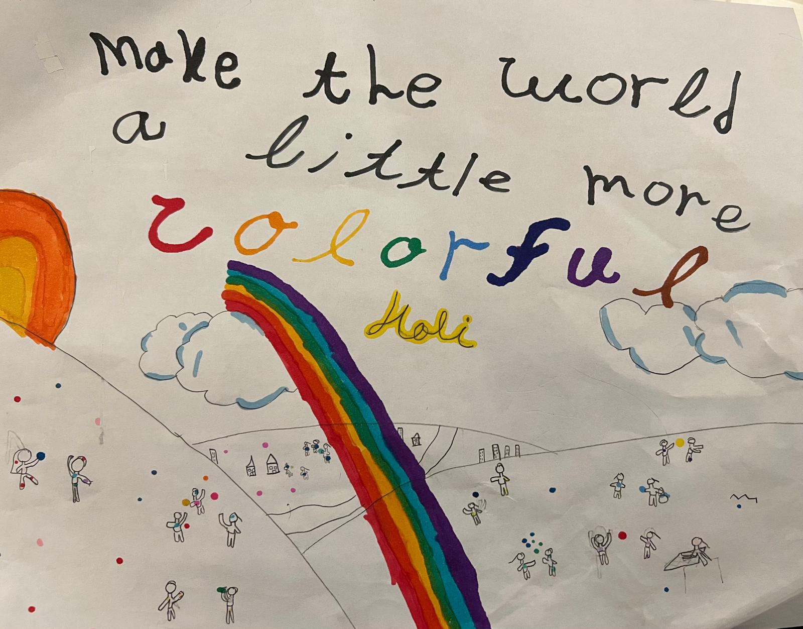 I created this art after celebrating Holi at my school. We splashed colorful powder at my friends. I love Holi. Make The World A little More Colorful – Myra Ann Chin
